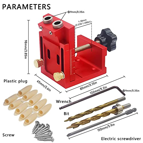 【Profondità di Foratura Regolabile】: Grazie alla vite di regolazione dorata, la profondità di foratura può essere regolata in base allo spessore della lastra e impostata facilmente senza chiavi ausiliarie, risparmiando tempo di lavoro. Morsetto per cacciavite: Spessore massimo del pannello di legno che può essere adattato: 12-40 mm, Dimensioni della punta del trapano: φ4 * φ9 * 170 mm, Angolo di foratura: 15°.
