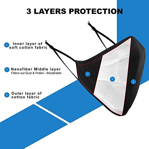 Materiale migliore: questa maschera multiuso e riutilizzabile ha un'eccellente traspirabilità sia per uso interno che esterno. Le nostre maschere hanno 3 strati di copertura. Gli strati interno ed esterno sono 100% cotone con uno strato centrale di filtro soffiato a fusione per una protezione 10x rispetto alla normale maschera in tessuto.