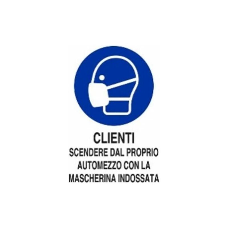 Codice: M0160050ALB0500X0350 Marca: MASCHERINE. Cartello Clienti Scendere Automezzo con Mascherina 50x35cm