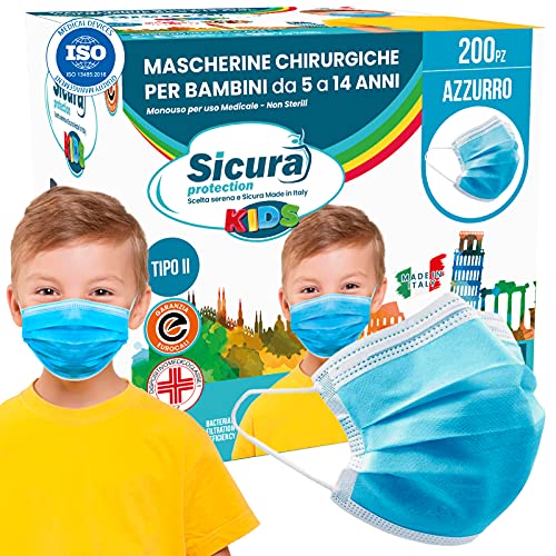 200 Mascherine Chirurgiche BAMBINI Certificate CE colorate AZZURRE Tipo II BFE ≥ 98% Made in Italy SICURA Prodotte in Italia - Mascherina da bambini bambino o bambina - 20 pacchi da 10 [200 Pezzi]