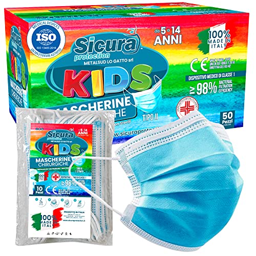 50 Mascherine Chirurgiche per Bambini Certificate CE Tipo II BFE ≥ 98% Prodotte in Italia - Mascherina Italiana monouso con elastici e nasello regolabile - 5 confezioni da 10 [50 Pezzi]