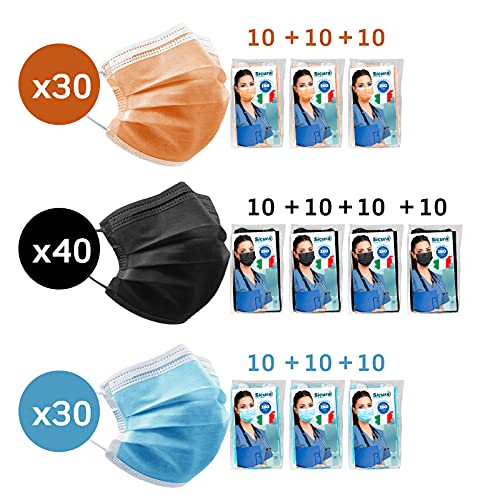100 Mascherine CHIRURGICHE NERE x40 AZZURRE x30 e ARANCIONI x30 Colorate per Adulti Certificate CE SICURA Tipo IIR BFE ≥ 98% Mascherina Chirurgica Colorata italiana Uomo Donna in 10 confezioni da 10