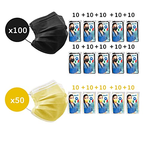 150 Mascherine CHIRURGICHE NERE x100 e GIALLE x50 Colorate Mix per Adulti Certificate CE Tipo IIR BFE ≥ 98% Mascherina Chirurgica Colorata italiana Uomo Donna in 15 confezioni da 10