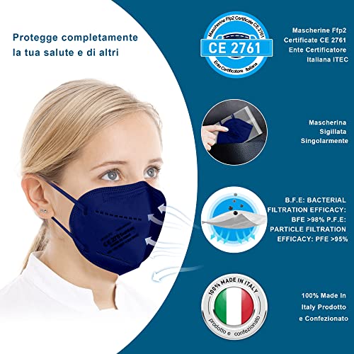 Mascherine Ffp2 Certificate CE 2761 Ente Certificatore Italiana ITEC 100% Made In Italy SICURA AFFIDABILE ITALIANA Ffp2 5 strati BFE ≥99% 100 Pezzi Blu