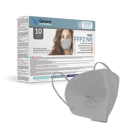 10 pz Mascherine FFP2 Certificate CE ESLH | Mascherina FFP2 GRIGIO 10 Pezzi sigillata singolarmente con 10 Ganci Salva Orecchie, 5 Strati di protezione PFE ≥ 94%