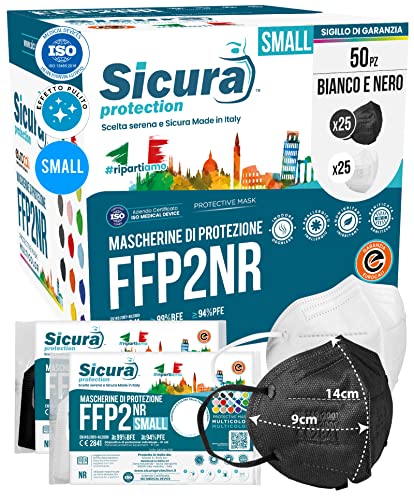 50 Mascherine FFP2 Small Size Certificate Taglia Piccola NERE e BIANCHE Made in Italy SICURA Protection BFE ≥99% | PFE ≥94% per Viso Piccolo sigillata singolarmente - 14x9cm filtrazione CERTIFICATA