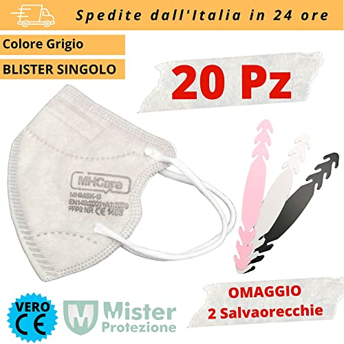 20 Mascherine Small Grigie FFP2 in TNT a 5 strati CE1463 Made in Europa sigillate singolarmente - Misure cm 10x12 in OMAGGIO 2 elastici salvaorecchie