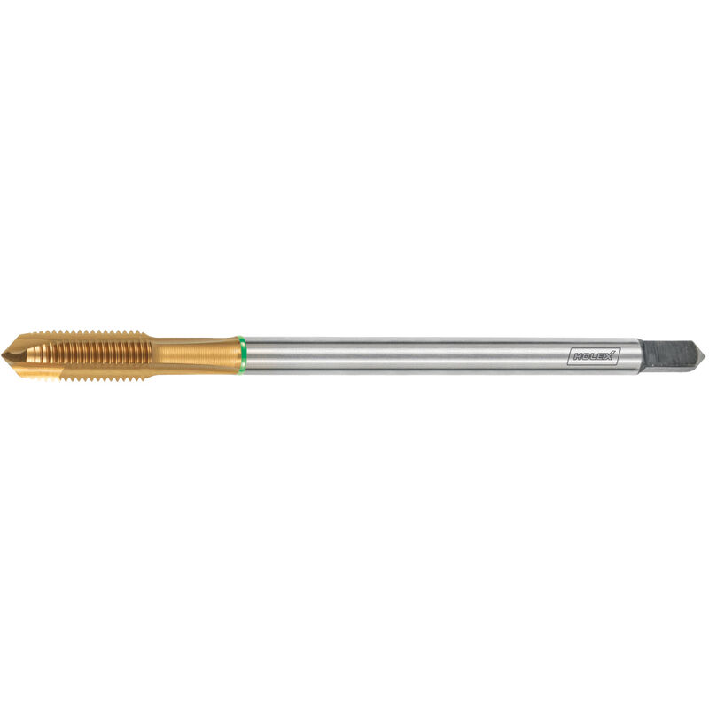 Maschio a filettare universale HOLEX Pro Tap. Esecuzione robusta progettata per un'ampia gamma di materiali. Materiale da taglio in HSS-E migliorato con rivestimento TiN a basso coefficiente di attrito. Dati tecnici Tipo di prodotto Maschi a filettare Angolo di filetto Grad 60 Utilizzo per tipo di foro fino a 3×D in caso di foro di passaggio Acciaio < 500 N/mm² m/min idoneo Rivestimento TiN Tipo di utensile di filettatura Maschi a macchina per i lavori dinamici INOX < 900 N/mm² m/min idoneo Olio idoneo Passaggio interno per LR no Alluminio (a truciolo corto) m/min idoneo Uni m/min idoneo Acciaio < 1100 N/mm² m/min limitatamente adatto Alluminio > 10% Si m/min idoneo Acciaio < 900 N/mm² m/min idoneo CuZn m/min limitatamente adatto Serie Pro Tap Colore collarino verde Codolo Codolo cilindrico con h9 Forma dell'imbocco B a umido max. idoneo Direzione di taglio destro Alluminio, plastiche m/min idoneo Acciaio < 750 N/mm² m/min idoneo Norma filettatura DIN 13 ⌀ Preforo, mm 7 Tipo di