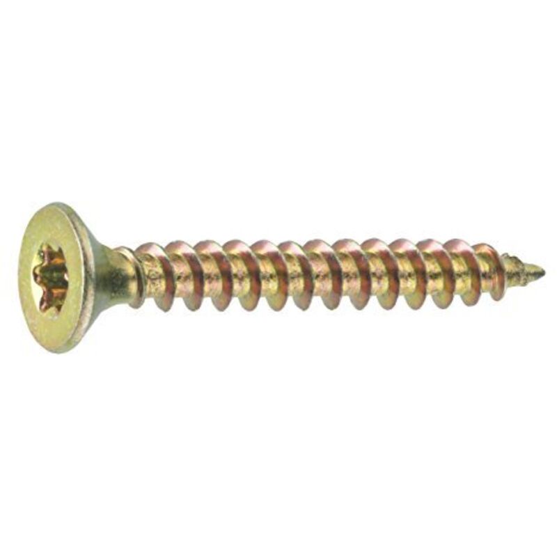 Testa piana svasata - impronta Torx Adatte sia per legno sia per truciolare Finitura zincata gialla Misure: Ø 4,0 x 30 mm Sacchetto da 616 pz