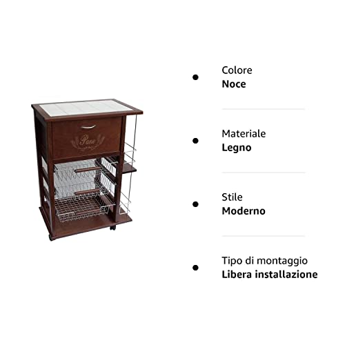 Maslegno Vesuvio - Carrello da cucina con cassetto per pane e portabottiglie noce