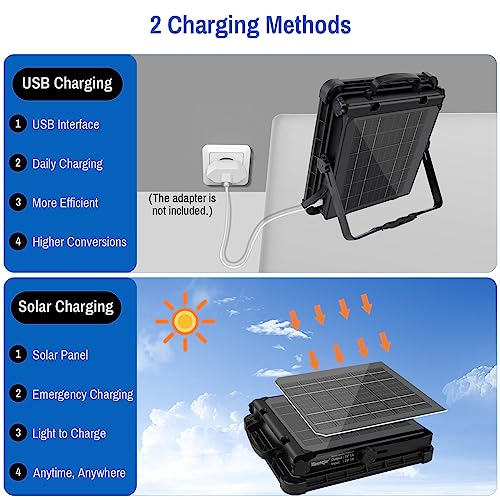 【2 METODI DI RICARICA】: Ha un pannello solare, per farlo caricare durante il giorno e un ingresso USB, per poterlo caricare con corrente, molto efficiente dal punto di vista energetico.