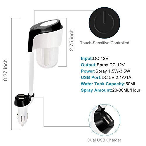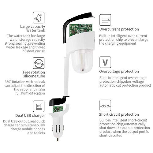 Multifunzione 4 in 1 - umidificatore per auto, diffusore di profumo, purificatore d'aria, caricatore doppia porta USB (2,1 A e 2,1 A). Promuove l'ambiente interno dell'aria condizionata dell'auto e le porte USB universali possono funzionare con tutti i dispositivi alimentati tramite USB, tra cui smartphone e tablet Android e Apple.