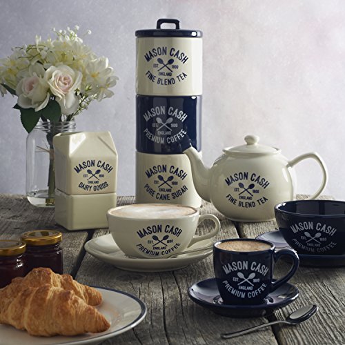 Mason Cash Varsity Stacking Tea Coffee Sugar Storage Set-Chip Resistente in Terracotta, Ceramica, Blu/Bianco, 13.5 x 13.5 x 32 cm
