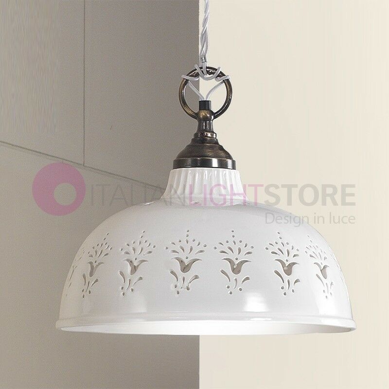il diffusore è impreziosito da una particolare lavorazione floreare traforata. La base a soffitto e gli altri particolari sono realizzati in ottone, finitura anticata spazzolata. Cavo intrecciato in seta, regolabile in altezza. Ideale per illuminare tavoli da pranzo e cucine dal particolare design rustico e country. La collezione di lampadari in ceramica Masseria è ispirata al passato e ripropone materiali classici come ceramica e ottone, sapientemente lavorati da artigiani secondo antiche tradizioni.Comprende il saliscendi, le lampade a sospensione e a plafoniera, le appliques a parete, i bilanceri e le lampade da tavolo (VEDI CORRELATI). Produzione 100% Made in Italy.