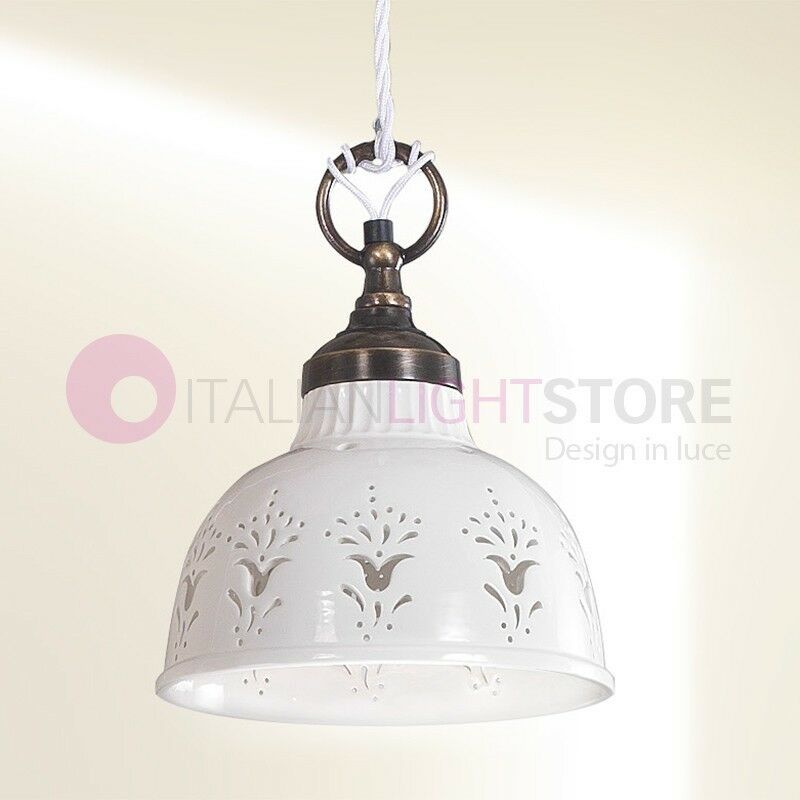 Lampada a sospensione con diffusore D.19 in ceramica bianca traforata e accessori in ottone. Piccola lampada a sospensione realizzata in ottone e ceramica bianca lucida con lavorazione traforata, in stile classico rustico country, collezione Masseria di Ceramiche Borso . La lampada ha elementi in ceramica bianca lucida;