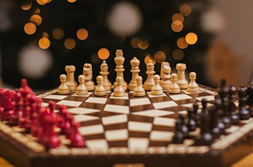Un set di scacchi esagonali in legno unico nel suo genere per giocare una partita per 3 persone. Ottimo per i genitori che vogliono giocare a scacchi insieme al loro bambino o per le persone che vogliono qualcosa di nuovo al tavolo degli scacchi. Questo set di scacchi fantasia può essere un regalo perfetto, esclusivo e originale per quasi tutte le occasioni.