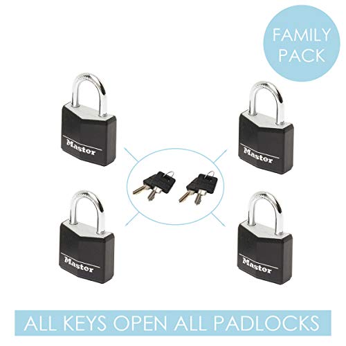 Master Lock 9120EURQBLKNOP Mini Lucchetto, Chiave, Set di 4, Pacco Famiglia, Ottimo per valigia e armadietto, Multicolore(Casuale), Piccolo