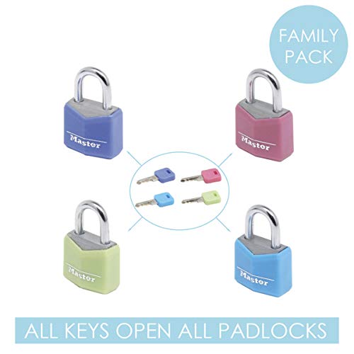 Master Lock 9120EURQCOLNOP Mini Lucchetto, Chiave, Set di 4, Pacco Famiglia, Ottimo per valigia e armadietto, Multicolore(Casuale), Piccolo