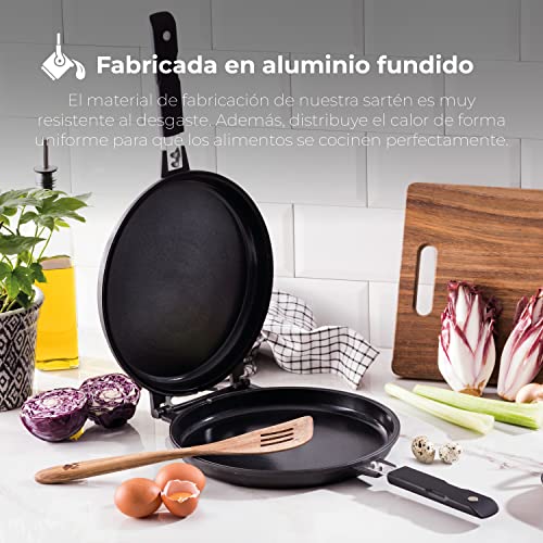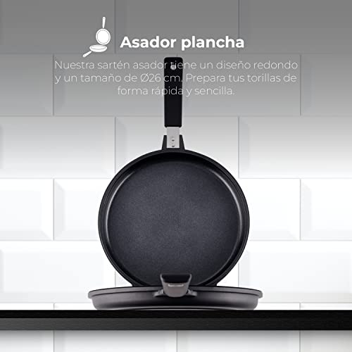 ROSTIERA PIASTRA DOPPIA: Prepara carne, verdura, pesce e gira le tue frittate. Elabora ricette con un sapore diverso e delizioso! La nostra padella griglia ha un design rotondo e delle dimensioni di 26 x 26 cm.