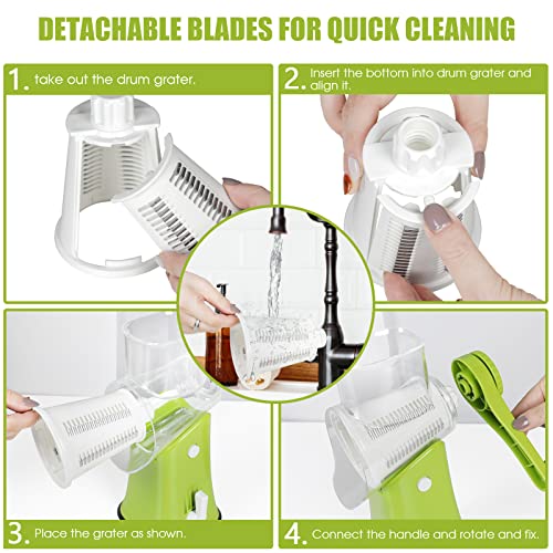 Considerazione per la sicurezza dell'utente: questa grattugia per verdure ha aggiornato il metodo di connessione della maniglia rotante. La manopola aggiuntiva viene utilizzata per fissare il tamburo rotondo e non cadrà più facilmente. La base di aspirazione bionica può essere fissata saldamente sul tavolo per evitare lo scivolamento durante l'uso.