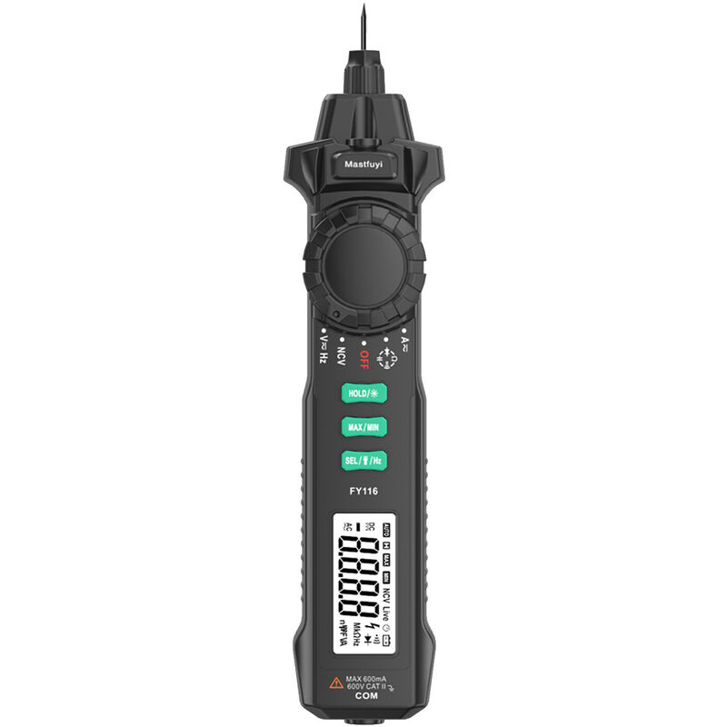 Questo strumento multifunzionale presenta la funzione di multimetro, penna di prova elettrica, cacciavite e torcia elettrica. Con schermo LCD retroilluminato per una facile lettura e dimensioni compatte per un facile funzionamento, può essere ampiamente utilizzato nei test elettrici, nella riparazione di automobili e in altre applicazioni. Nota: 1. Leggere attentamente il manuale dell'utente prima dell'uso. 2. Le dimensioni e il colore potrebbero essere leggermente diversi a causa della misurazione manuale e delle diverse condizioni di luce. Grazie per la comprensione. Specifiche: Colore: Nero Materiale: Plastica Schermo: LCD con retroilluminazione Vero RMS: sì Conteggio: 5999 conteggi Corrente: max. 600 mA CA/CC Tensione: max. 600 V CA/CC Resistenza: max. 60MΩ Capacità: max. 6mF Frequenza: max. 999,9 Hz Continuità: resistenza 50Ω, suono del cicalino MAX/MIN: sì Diodo: sì Alimentazione: batteria 6F22 9V (NON inclusa) Spegnimento automatico: circa 5 minuti Ambiente operativo: 0~40℃