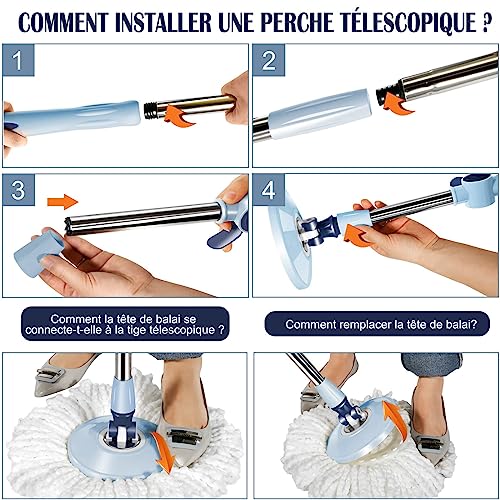 Masthome Mocio Lavapavimenti Rotante, 145cm Telescopico Rotante con 5 Testine in Microfibra Riutilizzabili e 5 Panni,Sistema Lavapavimenti Rotante con Secchio e Pedale per la Pulizia dei Pavimenti,Blu