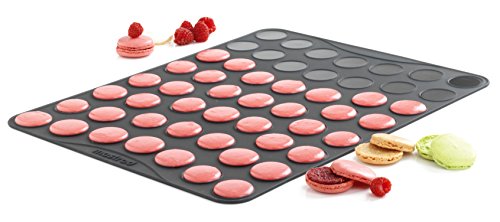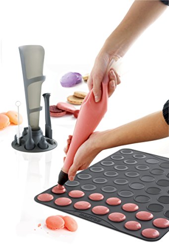 Il cofanetto macaron Mastrad comprende: un grande foglio da cottura in 100% silicone antiaderente con 53 stampi da 3,5 cm di diametro, un set sac à poche con supporto (1 poche da 0,5 L, 1 da 1 L, 6 beccucci, 1 pinza/ 1 tappo ermetico/ 1 spazzolino), 1 setaccio, 1 ricettario [lingua italiana non garantita]