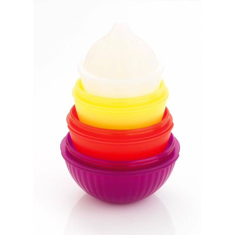 Dimensioni: 11,5 x 11,5 x 10 cm Colore: Viola / rosso / Giallo / Bianco Materiale: Polipropilene Lavastoviglie 4 forme, 4 taglie Impilabili Ideali per la conservazione di frutta e verdura già tagliata Controllo degli odori e della disidratazione