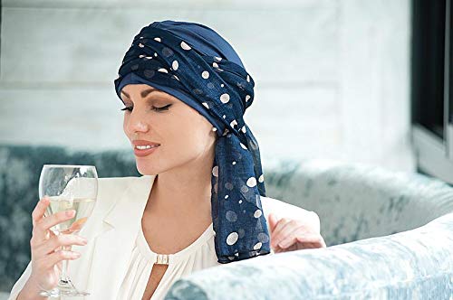 MASUMI Daisy - copricapo a turbante in cotone - per pazienti cancro, per chi soffre di alopecia o perdita di capelli - donna - Blu navy pois bianchi