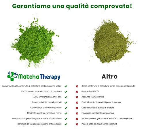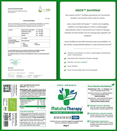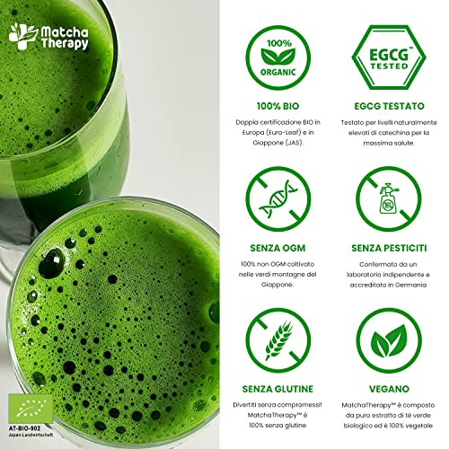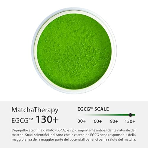 MatchaTherapy 130+ | Tè Matcha 100% Biologico | 60g | Almeno 130 mg/g di contenuto di catechina EGCG testato | Migliora sistema immunitario & livello di energia | Grado Premium | Tè verde dal Giappone