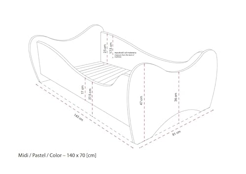Sicurezza La sicurezza dei più piccoli è la nostra priorità. Il letto ha bordi arrotondati ed è rivestito in morbido PVC per una maggiore sicurezza. Le dimensioni del lettino sono basse e adatte ai bambini piccoli. I lati rialzati proteggono da cadute accidentali. I letti sono disponibili nelle misure 140 x 70 cm (per bambini fino a 5 anni) e 160 x 80 cm (per bambini più anziani).