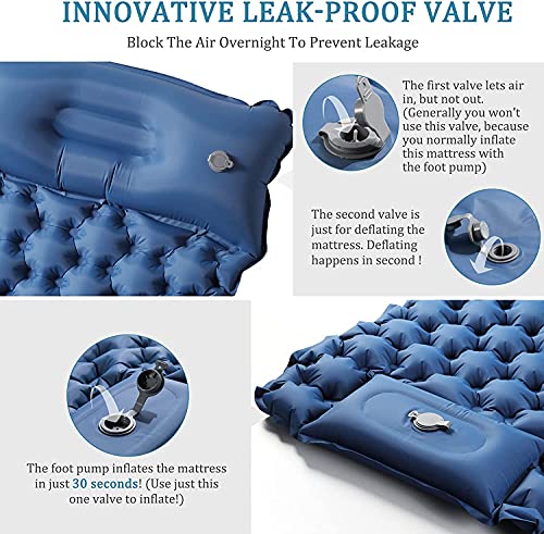 【Innovativa Pompa ad Aria Incorporata】basta premere o premere con la mano per gonfiare completamente il tappetino da campeggio in 1 minuto, il che è comodo e semplice. Molto più facile che gonfiare con il respiro o con un'altra pompa. Dispone di una valvola dell'aria a doppia azione a prova di perdite per gonfiare e svuotare il materassino.