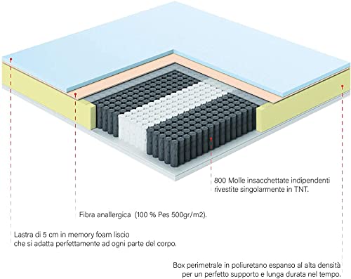 MATERASSO ORTOPEDICO: Possiede 800 molle indipendenti rivestite singolarmente in TNT Marchiato CE - Certificato Presidio Medico Classe I dal Ministero della salute con detrazione fiscale del 19% - Marchiato CE - Certificazione Oeko-tex su tutte le materie prime utilizzate (assenza di sostanze nocive) Tutti i materiali utilizzati per confezionare questo materasso sono realizzati in Italia. -Materasso a molle indipendenti insacchettate con memory da 5 cm a 9 zone differenziate - Altezza 25 cm.