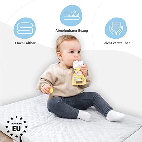 Dormire rilassante in movimento - il materasso pieghevole da terra può essere piegato 3 volte. Anche lontano dal lettino di casa, il tuo bambino può godersi la notte ben protetto su questo materasso per lettino da viaggio.
