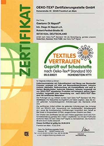 tutti i materiali usati godono di certificazione oeko-test standart 100 (fiducia nel tessile), numero di certificazione 0110048 che ne attestano la qualità e la conformità;