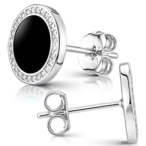 Orecchini rotondi piatti in argento Sterling 925 per donne o ragazze. Le gemme di onice nero e gli zirconi bianchi formano un bel contrasto elegante.