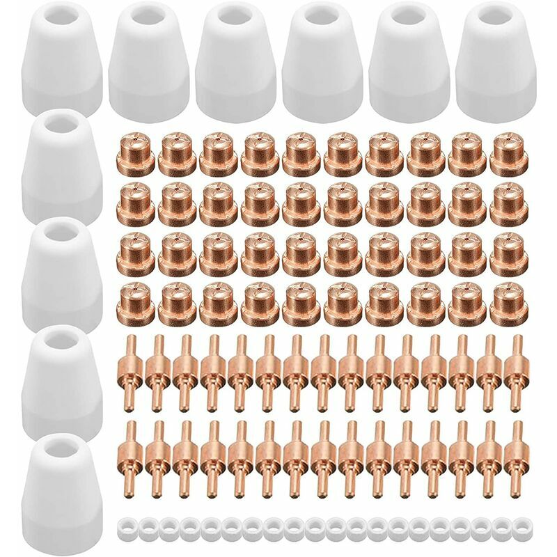 Struttura eccellente - L'ugello e l'elettrodo della macchina per il taglio al plasma ad aria sono realizzati in rame e la superficie è galvanizzata e liscia, con un'eccellente durata e una lunga durata. [Conduttività termica] Il la corrente di saldatura nominale dell'ugello della macchina per il taglio al plasma ad aria è di 40 A, che ha una forte conduttività termica e lo spessore di taglio è di 1-12 mm. < p>[Dimensioni] Lunghezza dell'elettrodo: circa 28 mm, lunghezza dell'ugello di taglio: circa 10 mm, lunghezza dell'anello in ceramica: circa 5,56 mm, lunghezza del bruciatore: circa 30 mm< /p> [Ambito di applicazione] L'ugello per il taglio al plasma e il gruppo elettrodo possono essere utilizzati con ESAB/L-TEC PT-31, JG-40, WSD-L-G40, come CUT-40, CUT-40D, L-GK-40, CT312, CT312D, CT416, CT416D, CT518D, Super160, Super160P, BPS40, ecc. [Il pacchetto include ] Il gruppo elettrodi taglia ugelli contiene 40 ugelli, 30 elettrodi, 10 coppette in ceramica e 20 cappucci e combustione