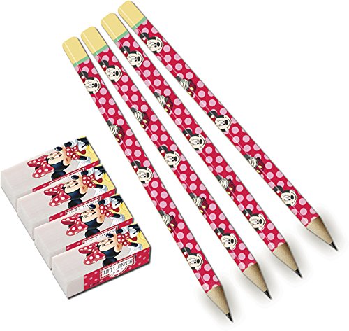 La confezione contiene 4 matite Disney Minnie Mouse (17.5 cm) e 4 gomme che misura 3,5 cm lungo