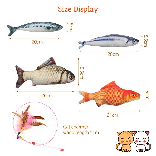 Giocattoli Catnip e Bastone Piuma: Il pacchetto include 4 diversi tipi di pesce catnip con forma di pesce chiara e realistica e un bastone divertente con piuma per gatto. Possono soddisfare le diverse esigenze del tuo gatto.