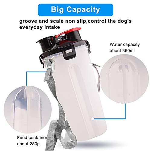 Design a doppio uso: progettato con due camere nella borraccia per cani 2 in 1 e contenitore per alimenti, uno per alimenti secchi e l'altro per acqua. Con due coperchi a scatto a bocca larga sulla parte superiore del tappo, facile per erogare snack o versare acqua.