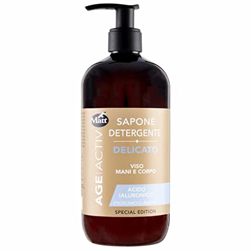 Matt, Sapone Detergente Delicato con Acido Ialuronico al Profumo d'Ambra, Adatto per Mani, Viso e Corpo, Idrata e Rende la Pelle Morbida e Profumata, 500 ml