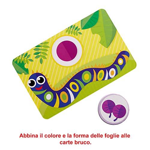 I bambini premono la pallina di Patty il Bruco per vedere cosa apparirà e abbinare i gettoni foglioline alle foglioline delle Carte Bruco. Possono giocare fino a 6 bambini per volta.