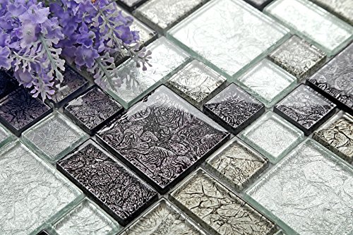 Mattonelle con mosaico in vetro, nero e argento opachi, con pietre, disponibili in tre diverse misure (MT0044) 30cm x 30cm