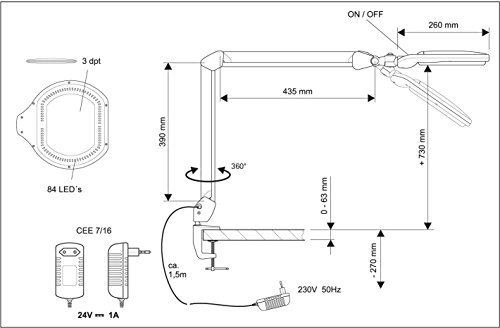Testa della lampada è girevole e inclinabile, che si trova una lente da 3 diottrie (ingrandimento di 1,75 volte).