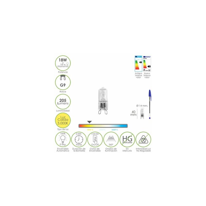 Lampadina alogena - Filettatura: G9. - Potenza: 18 W. - 3000 ° K. (Kelvin), luce calda, luce gialla. - 205 lumen. - Fascio/apertura luce: 360° - Accensione istantanea. - Durata lampadina 2.000 ore. - Cicli di accensione>100.000 - Senza mercurio. - Certificazione/efficienza energetica. A+/G (Nuovo regolamento UE) - Non adatto per dimmer. - Misura: Ø 14 mm. x 40 mm.(altezza) - Articolo noto come lampadine alogene, lampadine a faretto.