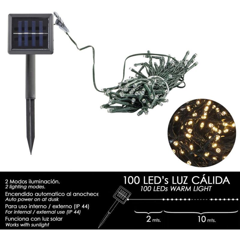 Batteria ricaricabile AA Ni-Mh 1,2 V 600 mAh inclusaSi accende automaticamente al crepuscoloLuce fissa (ON) e lampeggiante (MODE)Per uso esterno ed internoLunghezza cavo luci 10 mt.Lunghezza cavo alimentazione 2 Mt. - IP44 Bianco caldo