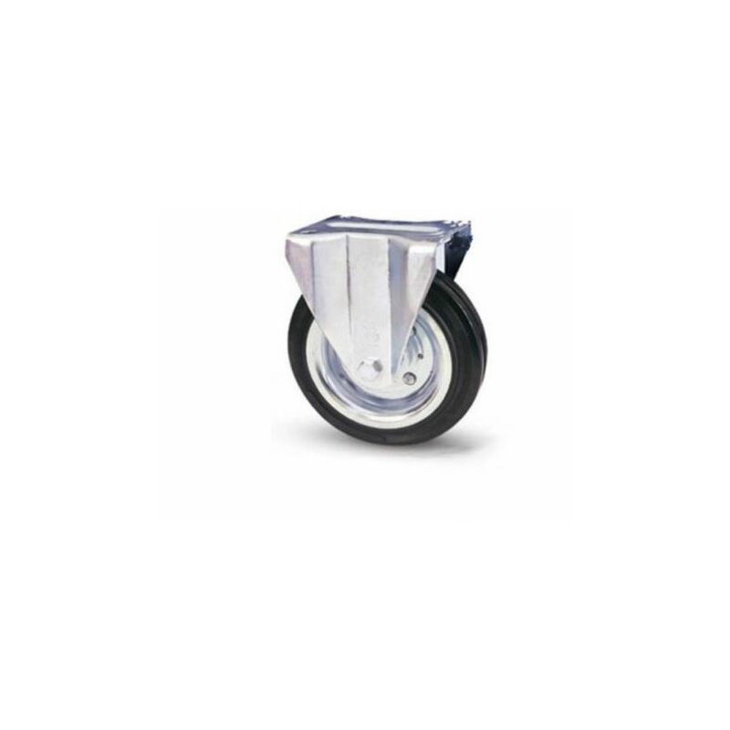 ruota in gomma nera con flange in acciaio.Diametro 80:portata 75 kg - piastra 85x100 cm. (15569)Diametro 125:portata 110 kg - piastra 85x100 cm. (20717)Diametro 150:portata 120 lg - piastra 85x100 cm. (34531)Diametro 200:portata 250 kg - piastra 145x110 cm. (15560) Supporto a piastra fissa e ruota in gomma nera e flange in ferro mozzo su cuscinetti a rulli.Diametro 100:portata 70 kg - piastra 80x102 cm. (15572)Diametro 160:portata 140 kg - piastra 145x110 cm. (15575) PIASTRA GIREVOLE Supporto a piastra girevole, con ruota in gomma nera con flange in ferro mozzo su cuscinetti a rulli.Diametro 80:portata 50 kg - piastra 102x80 cm. (15570)Diametro 125:portata 100 kg - piastra 102x80 cm. (15574)Diametro 160:portata 140 kg - piastra 135x110 cm. (21448) Supporto a piastra girevole, serie leggera, zincato;