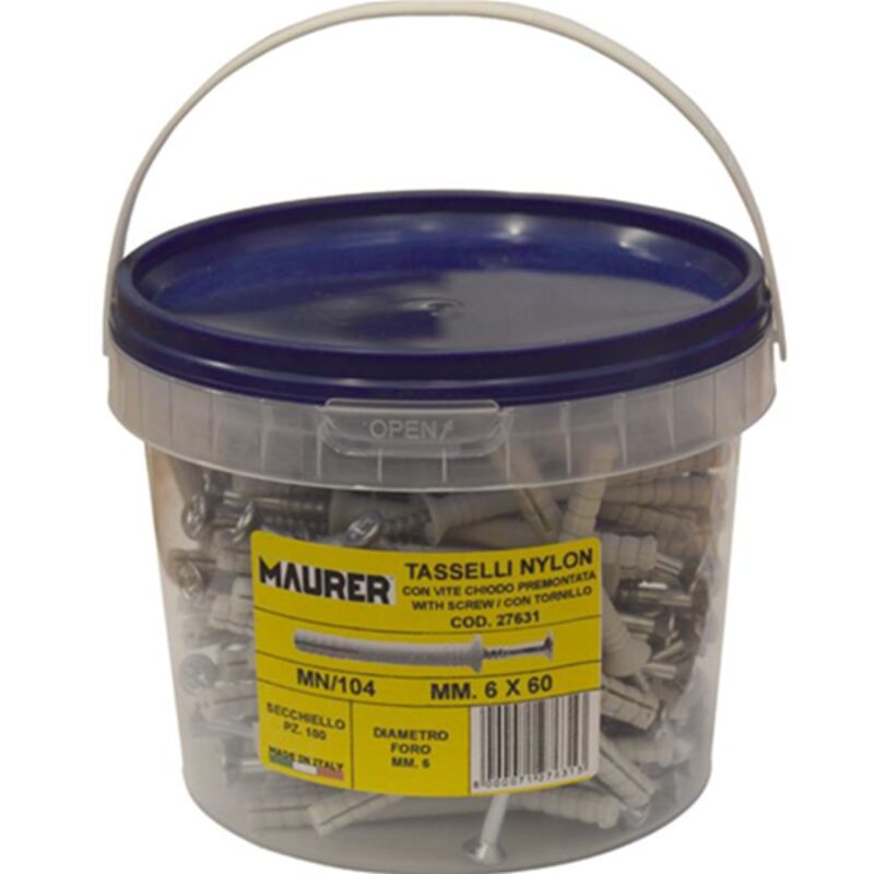 Pratica confezione con secchiello di tasselli in nylon serie MN Confezione: 1 CF Articolo MN-104 x L. 6x60 mm. Confezione 100 pz.
