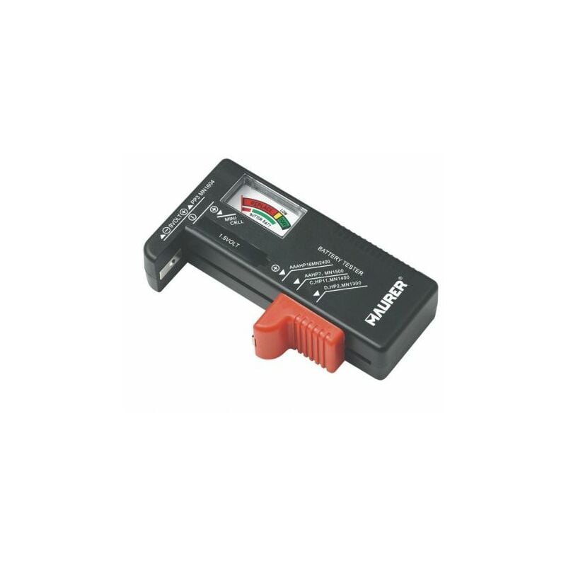 TESTER PER BATTERIE Tester in grado di verificare lo stato di carica di batterie del tipo: AA, AAA, C, D, a 1,5, pile a 9V e batterie a bottone a 1,5V Se la lancetta non si muove controllare che la batteria tocchi correttamente entrambi i contatti prima di considerare che sia completamente scarica. Non richiede alcuna alimentazione. Si attiva con l'energia delle batterie da controllare.