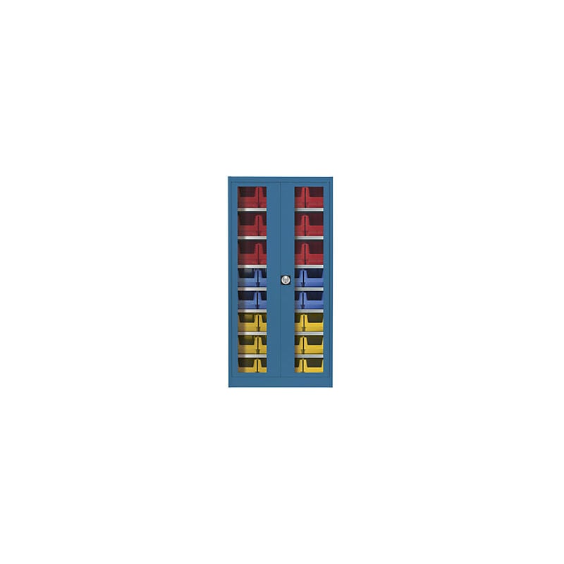 Armadio con ante a battente con finestrella, con 32 cassettine, blu brillante. Fornitura = montato. Altezza = 1950 mm. Larghezza = 950 mm. Profondità = 420 mm. Struttura = saldata. Materiale = acciaio. Superficie = verniciatura a polvere. Numero ripiani = 7 pz. Materiale ripiani = zincato. Portata per ripiano = 80 kg. Passo di regolazione altezza ripiani = 35 mm. Cassettine numero / lungh. x largh. x alt. = 8 x blu / 350x210x140 mm, 12 x giallo / 350x210x140 mm, 12 x rosso / 350x210x200 mm. Colore corpo = blu brillante RAL 5007. Colore porta = blu brillante RAL 5007. Tipo di porta = ante a battente con finestrella. Serratura = serratura a cilindro girevole con chiusura a triplo chiavistello, 2 chiavi incluse. Numero cassette = 32 pz. Peso = 77.39 kg. Contenuto dell'armadio ben visibile per non rimanere senza scorte. Grazie alla grande finestrella robusta, si ha una panoramica completa del materiale a disposizione che resta tuttavia al sicuro sotto chiave! Corpo Robusto corpo in